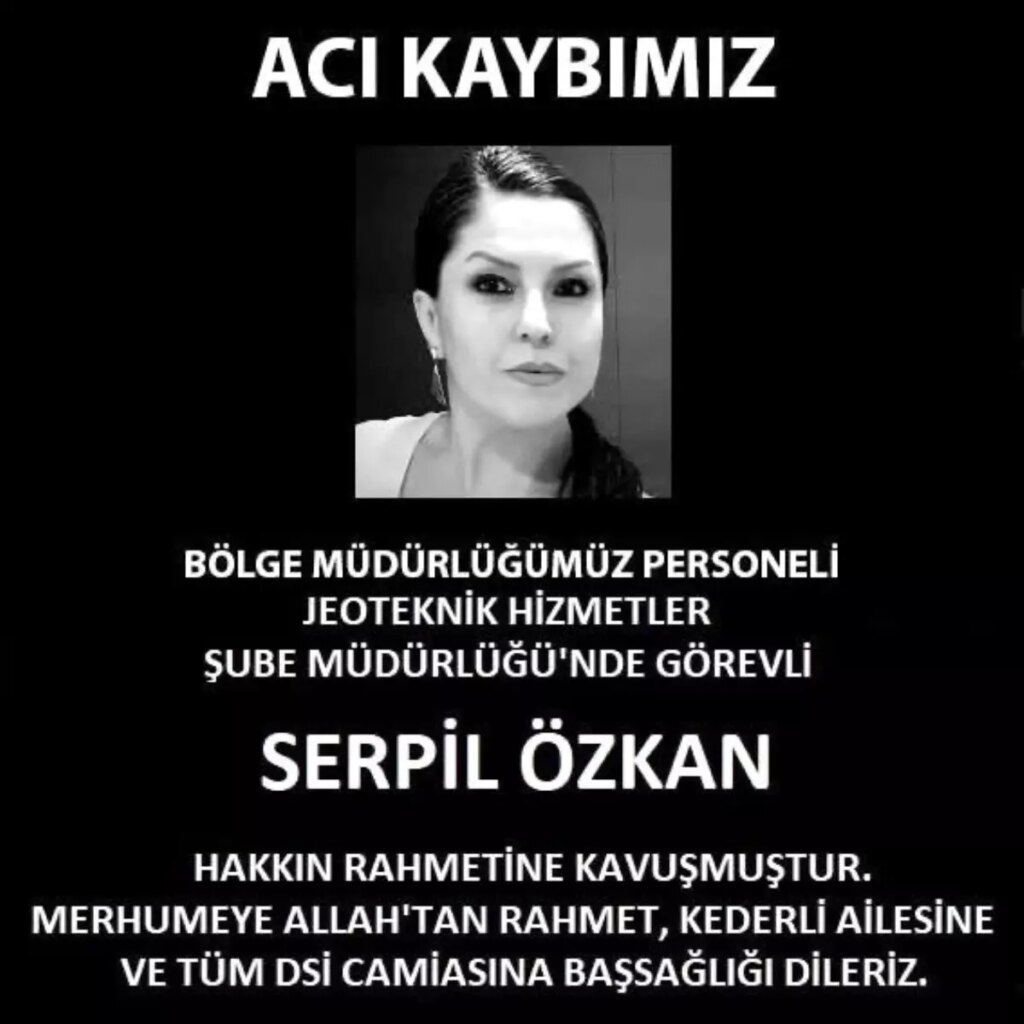 Kurumun sosyal medya hesabından yapılan paylaşımda, “Acı kaybımız. Bölge müdürlüğümüz çalışanı Jeoteknik Hizmetler Şube Müdürlüğü’nde misyonlu Serpil Özkan hakkın rahmetine kavuşmuştur. Merhumeye Allah’tan rahmet, kederli ailesine ve tüm DSİ topluluğuna başsağlığı dileriz” tabirlerine yer verildi. – ESKİŞEHİR