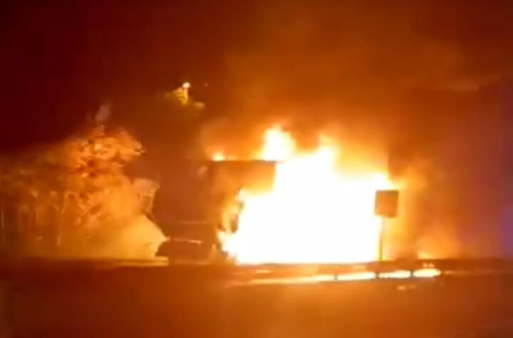 Eskişehir'in Sivrihisar ilçesinde patlayan lastikten çıkan kıvılcımlar nedeniyle yangın çıkan tır, itfaiye gruplarının müdahalesiyle...